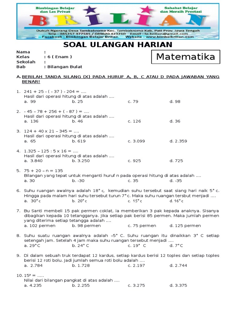 Nov 29, 2017 · pada artikel sebelumnya kami sudah membagikan soal matematika kelas 6 sd untuk ujian nasional berisi materi operasi hitung campuran bilangan cacah.